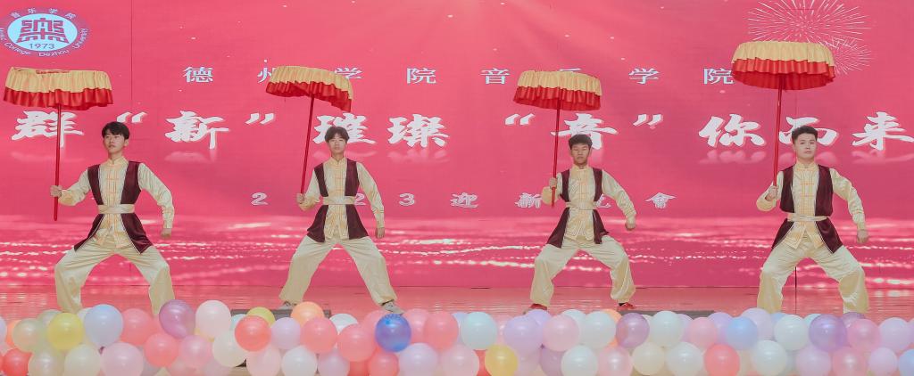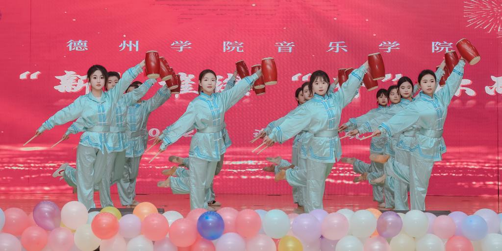 12月5日,由久久久久久九九99精品大樊海伦副教授、王雷老师编创,校蹦鼓舞社团学生演绎的舞蹈《鲁北鼓韵》在德州学院音乐厅成功上演。
