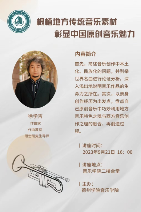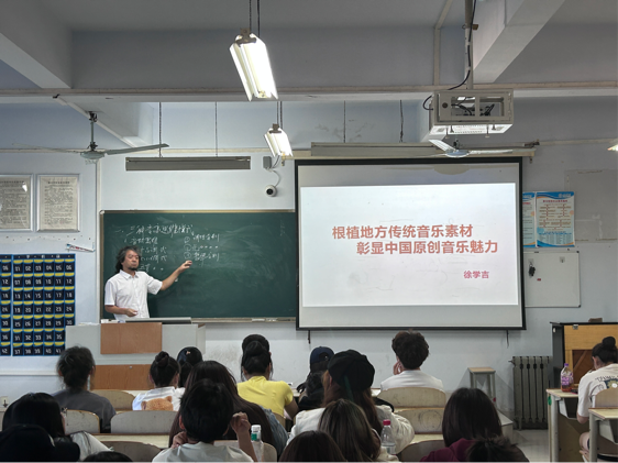 此次讲座徐学吉教授从三种音高思维模式、外国音乐中民族化写法分类与简介、音乐风格主张等方面进行了介绍。徐学吉教授以详实有据的分析、加之生动精彩的演绎为同学们简述音乐创作中本土化、民族化的问题,并列举世界名曲进行论证分析,深入浅出地说明音乐作品的生命力之所在。最后徐教授播放了自己创作的《春绿在人间》《呼唤第一乐章》等作品,通过赏析让同学们进一步了解音乐创作的魅力。