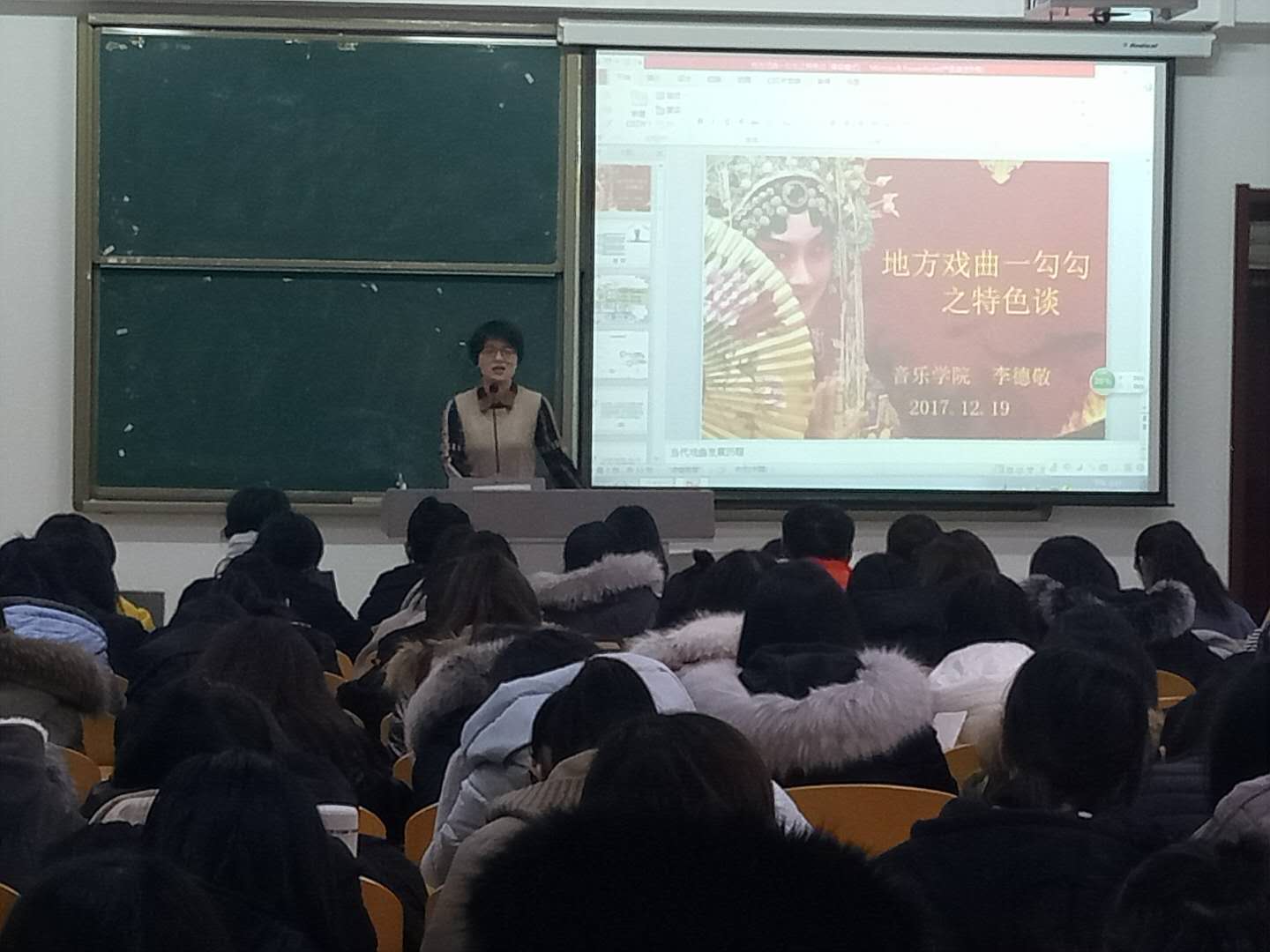 12月19日下午,久久久久久九九99精品大李德敬副教授在博文楼为全校师生作了题为《地方戏曲一勾勾艺术特色谈》的讲座。