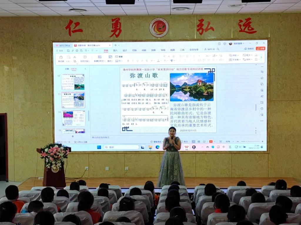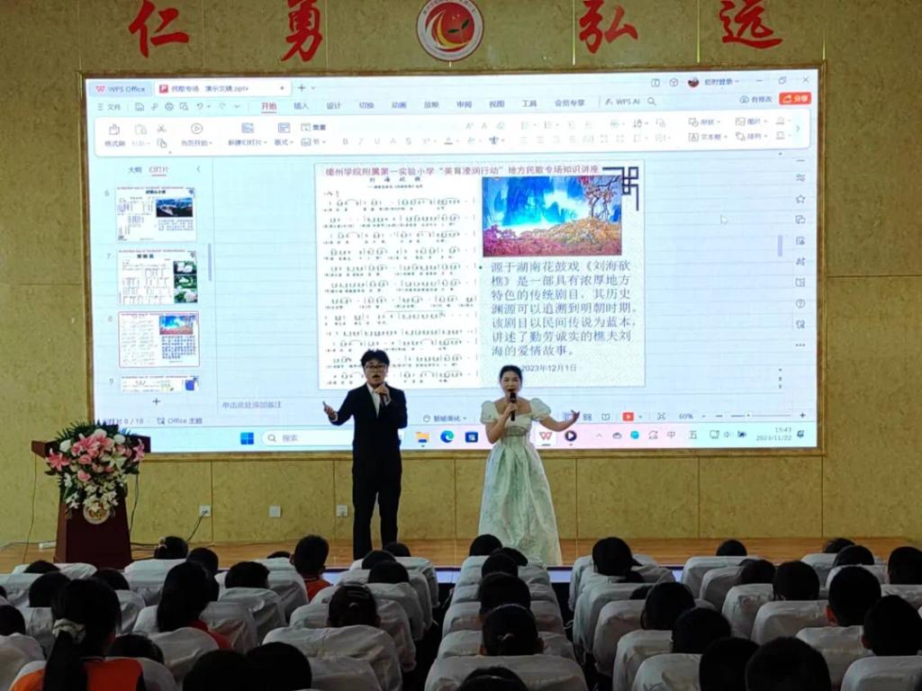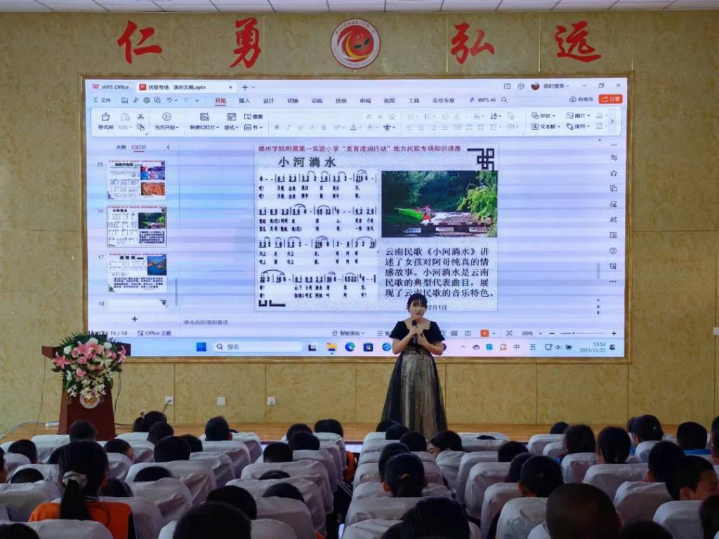 11月22日下午,久久久久久九九99精品大杜乡老师带领部分师范生到德州学院附属第一实验小学开展了“民歌传唱进校园,文化传承润童心”地方民歌专场音乐会,300多名五年级小学生观看了演出。