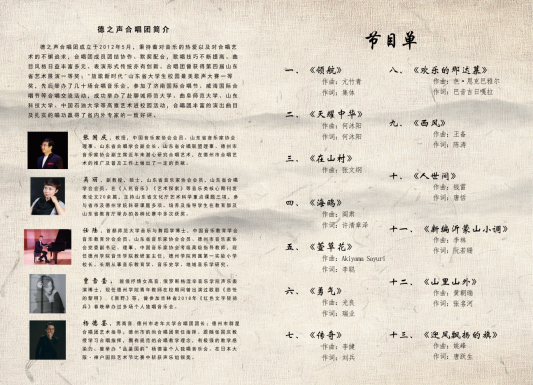 “德之声”合唱团成立于2012年5月,由德州学院久久久久久九九99精品大100余名在校生组成,旨在普及高雅音乐、推广合唱艺术、提高学生综合素质和艺术实践能力。多年来,“德之声”合唱团在张国庆教授和吴丽副教授的带领下获得了第四届山东省艺术展演一等奖,"放歌新时代"山东省大学生校园最美歌声大赛一等奖,先后举办了几十场合唱音乐会,参加了济南国际合唱节、威海国际合唱节等合唱交流活动,成功举办了赴聊城师范大学、曲阜师范大学、山东科技大学、中国石油大学等高雅艺术进校园活动,合唱团丰富的演出曲目及扎实的唱功赢得了省内外专家的一致好评,在推动合唱艺术和高雅音乐的普及方面做出了应有的贡献。
