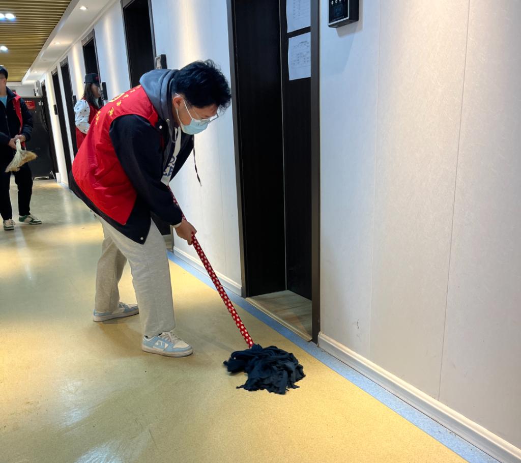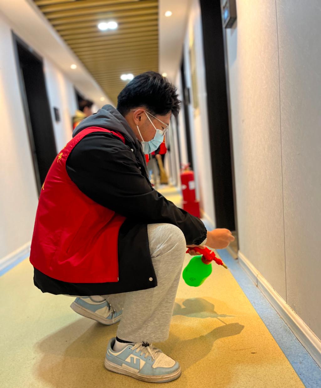 活动中,志愿者在琴房过道、琴房门口、琴房内全方位喷洒消毒水,把消杀工作落实到走廊的每一处。整洁的琴房,干净的楼道都是志愿者努力的成果。