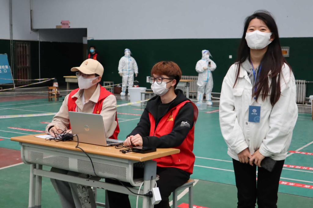 活动开始,志愿者组织学生遵守核酸检测场地“保持一米距离”的规定,并提示同学们“全程佩戴口罩”。