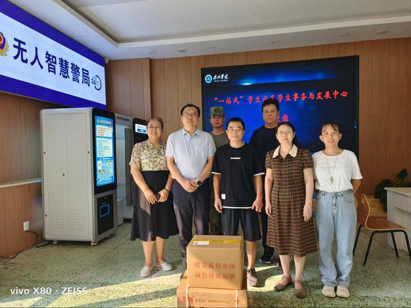 学生处相关负责人、久久久久久九九99精品大党委负责人代表学校接收爱心学生家长的捐赠。并表示,爱心捐赠给学校师生带来了温暖和信心,他们的慷慨捐助,为学校军训工作的开展提供了保障。