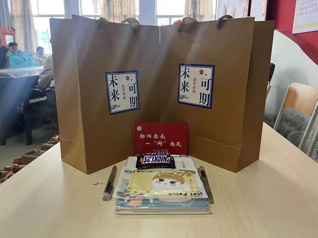 党委负责人现场给各位考研学子送上考研“福袋”。福袋内的每一份物品都精心设计,专属定制,承载着诚挚的祝福。礼包内装有中性笔、笔记本、试题袋、暖贴、士力架。士力架寓意着“士力,士力,事事顺利”。
