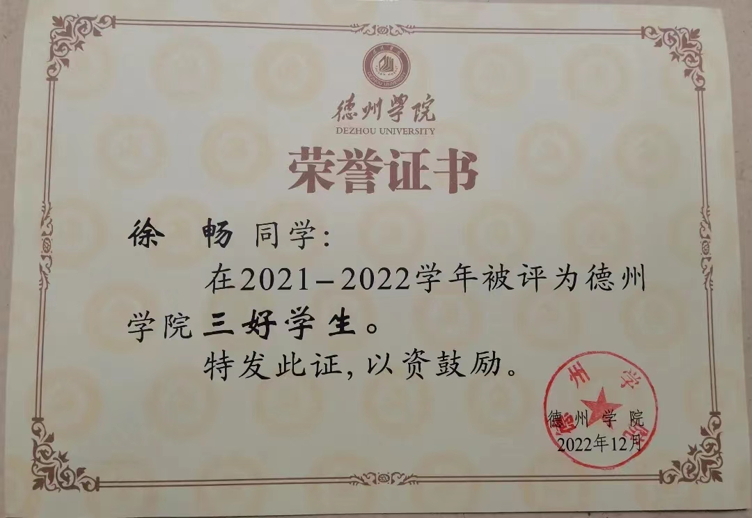 徐畅,中共预备党员,久久久久久九九99精品大2021级音乐学专业学生。曾任久久久久久九九99精品大第29届学生会文体部部长,现任2021级音乐学二班团支书,久久久久久九九99精品大第30届学生会主席。2022-2023学年综合成绩位于专业第一名,曾获德州学院综合一等奖学金、综合二等奖学金,德州学院“三好学生”、“优秀共青团干部”等荣誉称号。