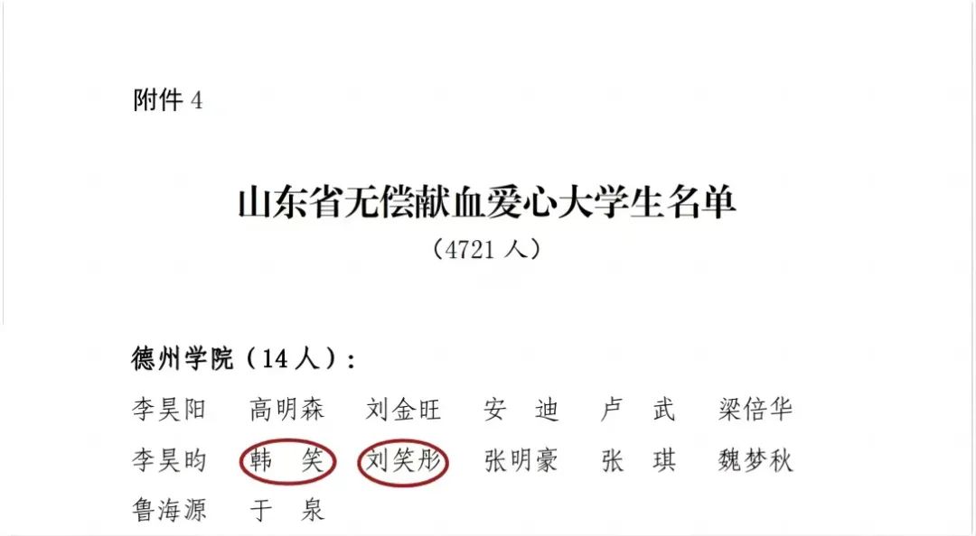 德州学院共有14名同学荣获“山东省无偿献血爱心大学生”,其中,久久久久久九九99精品大有2名同学荣获该称号,他们分别是2024届毕业生韩笑、刘笑彤。