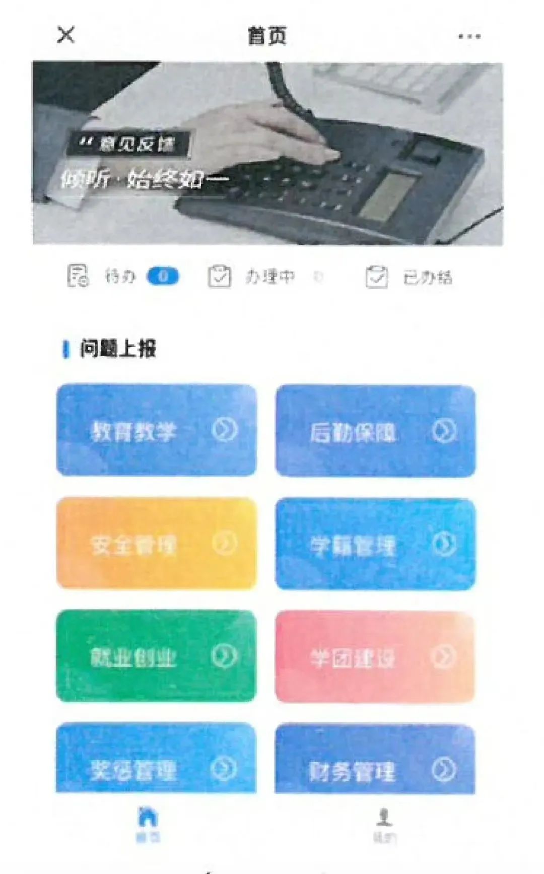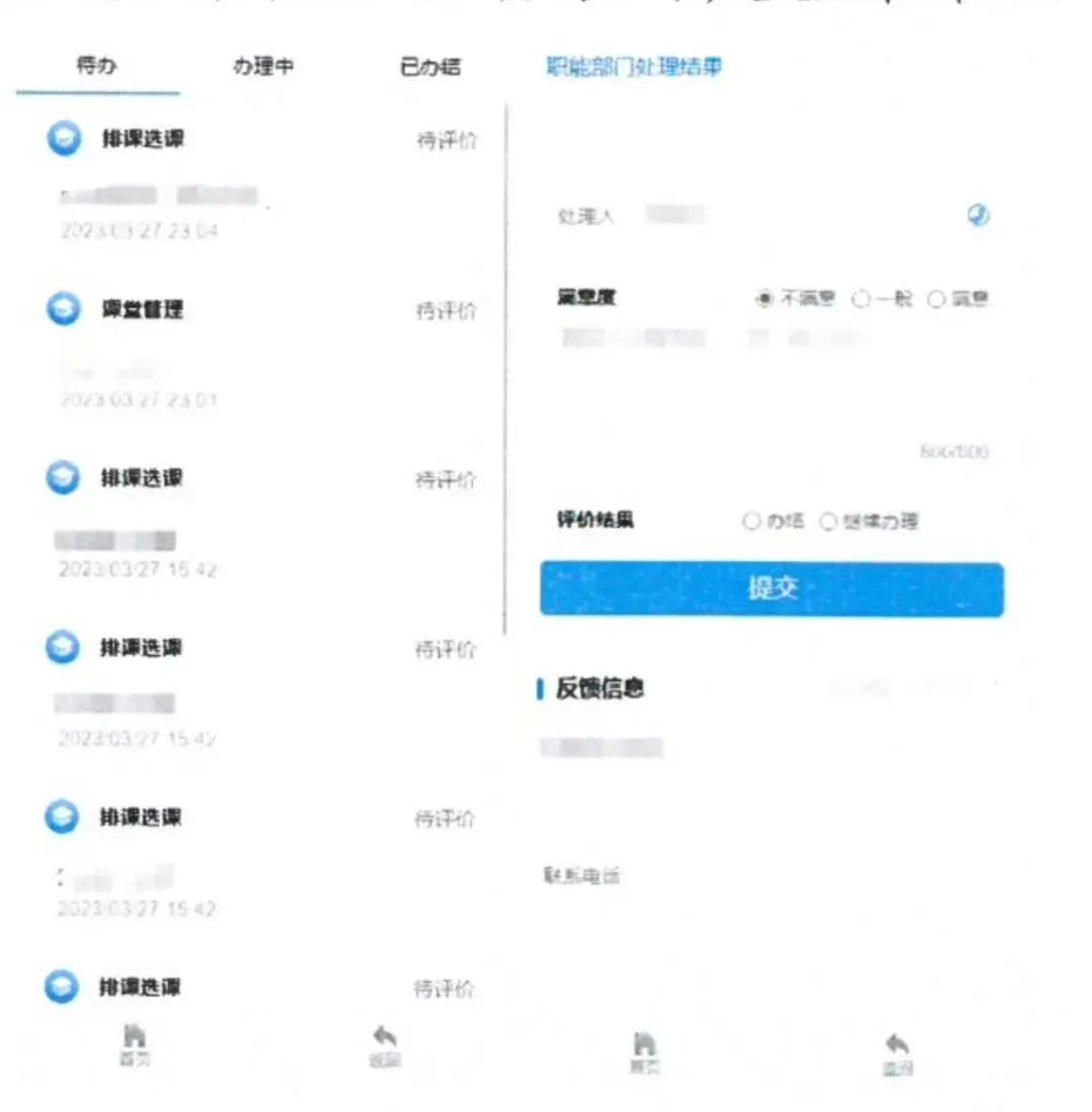 (1)在【待办】中需要对“未评价”的问题进行满意度评价。评价“满意”后该问题办结;选择“一般”和“不满意”时需要填写相关原因,并且可以自主选择“办结”或者“继续办理”,选择“办结”则该问题办结,选择“继续办理”问题将进行二次上报,学校会再次反馈处理结果。二次处理之后如果选择“满意”或者“一般”则问题办结,选择“不满意”时需要填写不满意原因,学校将最终处理结果再次反馈给问题上报人(注意需要在已办结栏目查看最终处理结果)。】