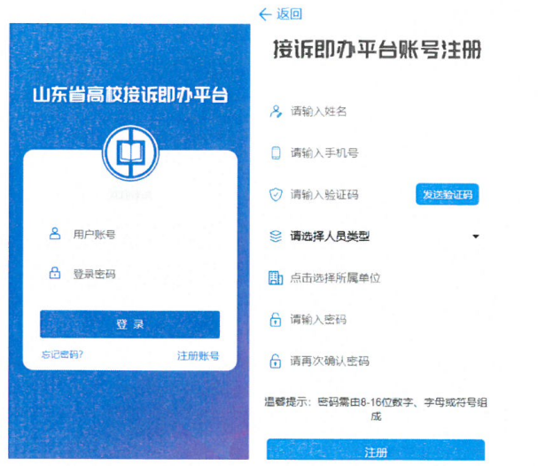 2、使用平台需要注册账号。在平台登录页找到“注册账号”按钮,填写真实姓名、手机号(可接收短信验证码)、人员类型、所属单位以及登录密码等信息。信息填写完成后点击底部的“注册”按钮即可完成注册,在登录页面输入注册时填写的手机号和密码即可登录。