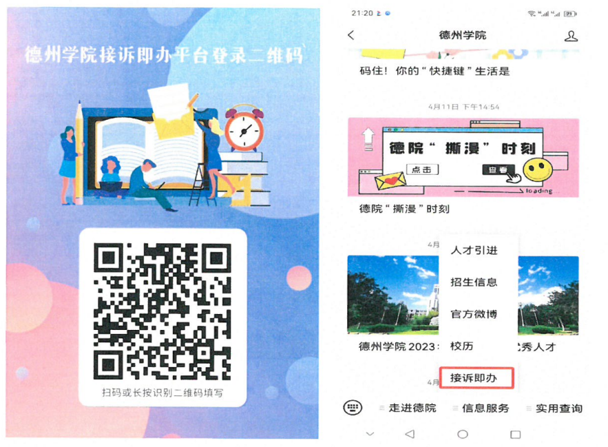 1、微信搜索关注【德州学院】公众号,找到【信息服务】-【接诉即办】菜单(也可通过学校官网首页“德州学院接诉即办平台”链接进入,或者微信扫“德州学院接诉即办平台登录二维码”进入)。