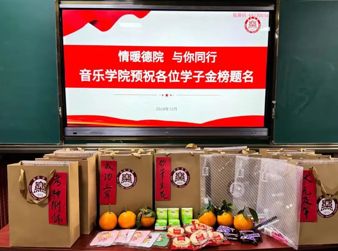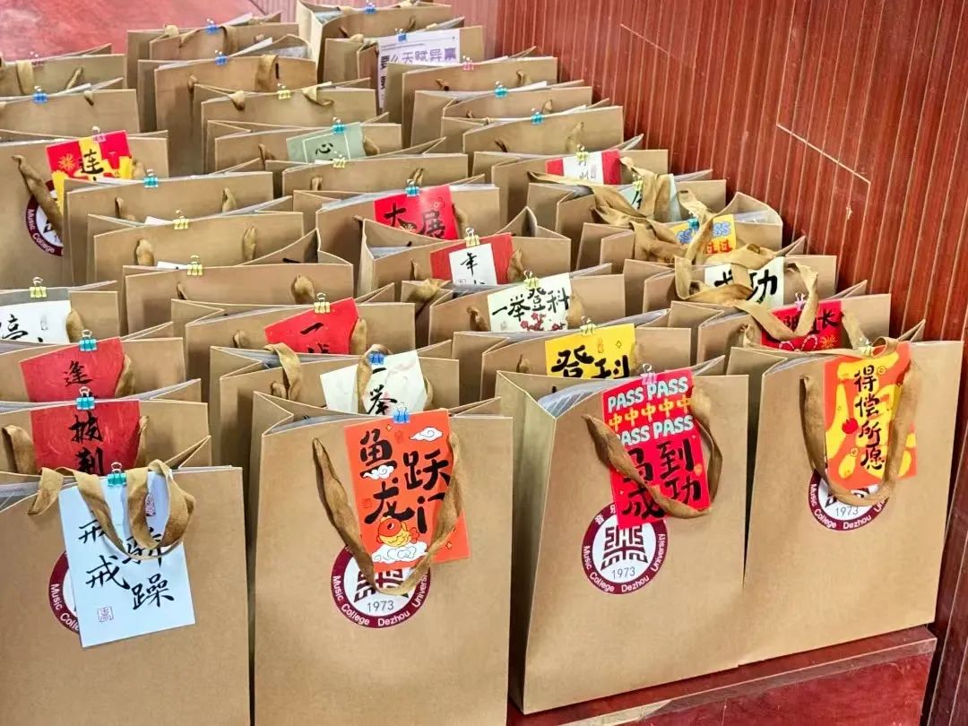 活动中,各年级志愿者主动拿起卫生工具,认真打扫考研教室和琴房,清扫地面、归置乐器以及擦拭桌面、窗台等各处灰尘,为备考学子营造干净舒适的学习环境。学院师生同写祝福语,表达对备考学生的美好祝愿,并亲手将祝福贺卡、便利贴、条幅等装点在琴房与教室中,以鼓励学生在最后冲刺的阶段不松懈、不畏惧。学院精心准备考试大礼包,为备考学子保驾护航。考试用具满满诚意,寓意“书写青春,笔扫千军”。祝福贺卡与橙子,寓意“橙功上岸,金榜题名”。