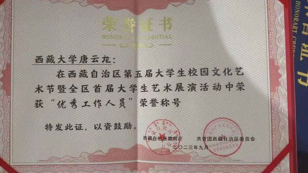 1.2023年9月在西藏自治区第五届大学生校园文化艺术节暨全区首届大学生艺术展演活动中荣获“优秀工作人员”荣誉称号。