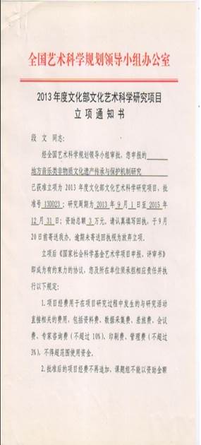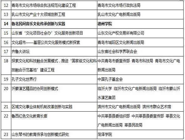 2013年12月13日,首届山东省文化创新奖成果报告会在济南举行,会上公布了首届山东省文化创新奖30个获奖项目,德州学院申报的《鲁北民间音乐文化传承创新与实践》在近200项申报项目中脱颖而出,荣获首届山东省文化创新奖。此次评选中全省高校有8所学校申报的项目获奖,德州学院副校长巩建闽教授、久久久久久九九99精品大院长张国庆教授及项目负责人段文教授代表学校参加了颁奖典礼。