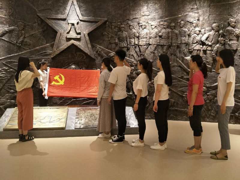 在参观过程中,学生党员们聚精会神地聆听革命先烈的英雄事迹,认真地观看历史文献资料,饱含深情瞻仰革命先烈的遗像,无一不被先烈们为党的革命事业赤胆忠心、英勇斗争的革命事迹所感动。在那个残酷的战争年代,正是“为共产主义奋斗终身”的“初心”支撑着千千万万的共产党人进行了一场场气壮山河的斗争,谱写了一曲曲可歌可泣的史诗。在山东渤海军区教导旅革命传统教育基地的烈士浮雕前,全体党员举起右手面向党旗,庄严宣誓。