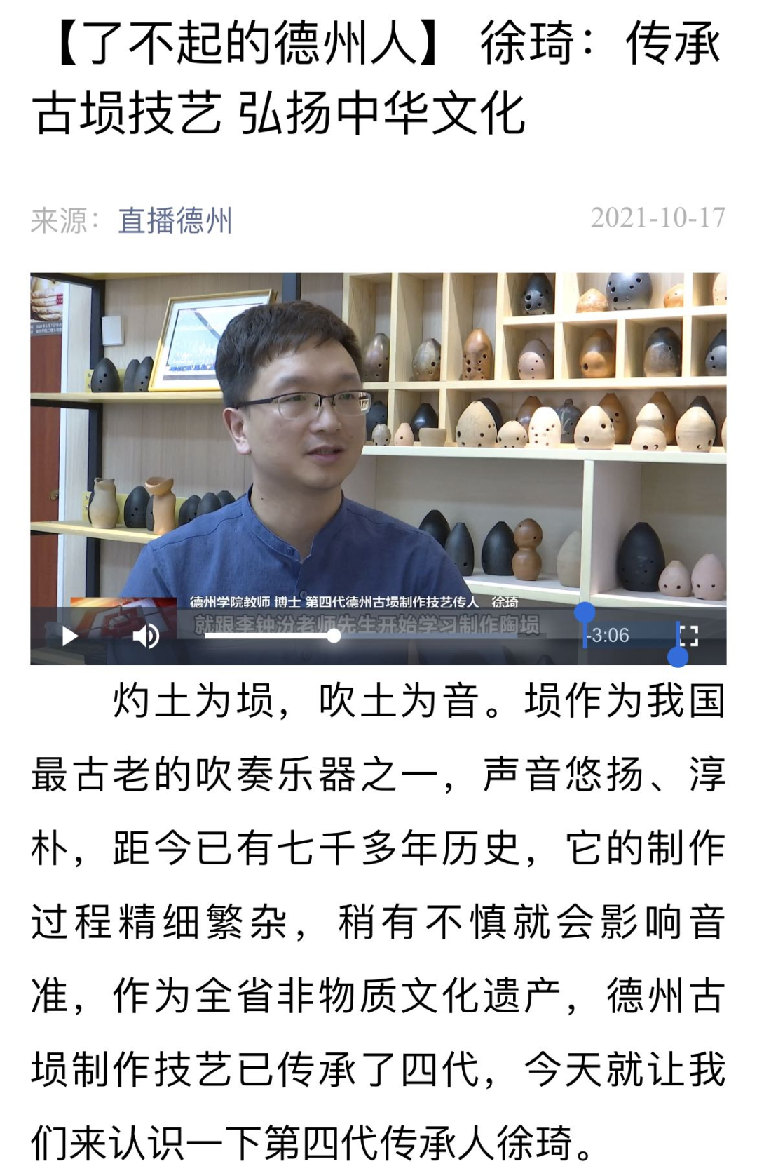 徐琦成立了“德州古埙”课题研究小组,利用课上及课余时间研究非遗项目,并开展了课题采风、研讨、手工制作实践等多项活动。徐琦依托“十二五”、“十三五”重点学科——“地域音乐文化”项目,把“德州古埙”作为重点研究内容之一。自学校2012年正式开设课程以来,每年培养学生约30人,曾先后制作出百余个陶埙。其中第一届学生在民乐队中担任了埙声部的演奏任务,并参与录制了山东卫视《话说运河》栏目的主题曲。2017年10月,徐琦被德州市文广新局评为“德州市第四批非物质文化遗产代表性传承人”。