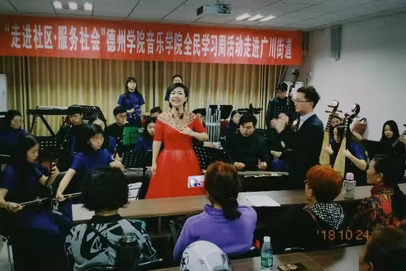 24日“中国传统文化进社区活动”由实践教研室主任徐琦老师主持,“德之韵”民族管弦乐团30多名成员参与演出。首先,由徐琦老师介绍了民族管弦乐团,民乐团下设四个声部:吹管乐声部(唢呐、笛、笙),拉弦声部(二胡),弹拨声部(琵琶、古筝、阮),打击乐声部(扬琴、鼓、锣、镲、木鱼、碰铃等)。接着,由管弦乐团的各位学生为社区成员展演了《千年运河展新颜》等曲目,通过徐琦博士的讲解交流,社区成员的每个人都受到了很大的启发。25日“社区大讲堂活动”主要由声乐教研组薛莲老师和李琛老师进行组织学习交流。首先,由两位老师分别向社区成员介绍了如何来演唱歌曲,并作出了歌曲展示,社区成员们都分别提出了自己在演唱过程中的问题与不足,主要是气息不到位,用嗓太多,两位老师针对这些问题为社区成员做出了纠正与示范,接着,在两位老师的指挥下,由社区成员合唱了《我和我的祖国》等曲目,最后,由社区成员个人做出歌曲展示,并由我院两位老师提出建议、进行指导。