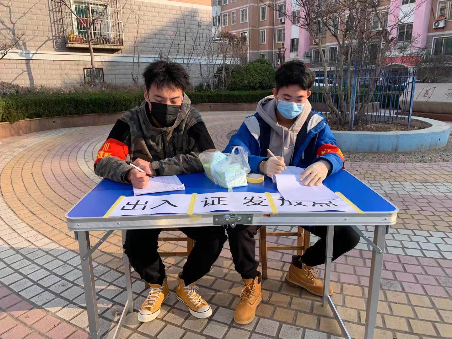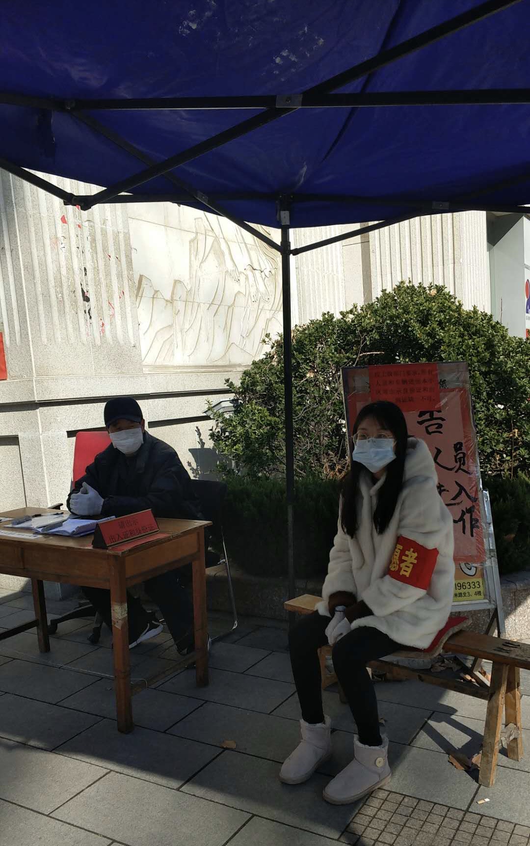 2018级音乐表演一班学生崔雯潇在山东省淄博市东街社区御景国际小区门口劝返点,每天坚持查看小区进出人员的出入证和身份证件,协调小区住户的矛盾。