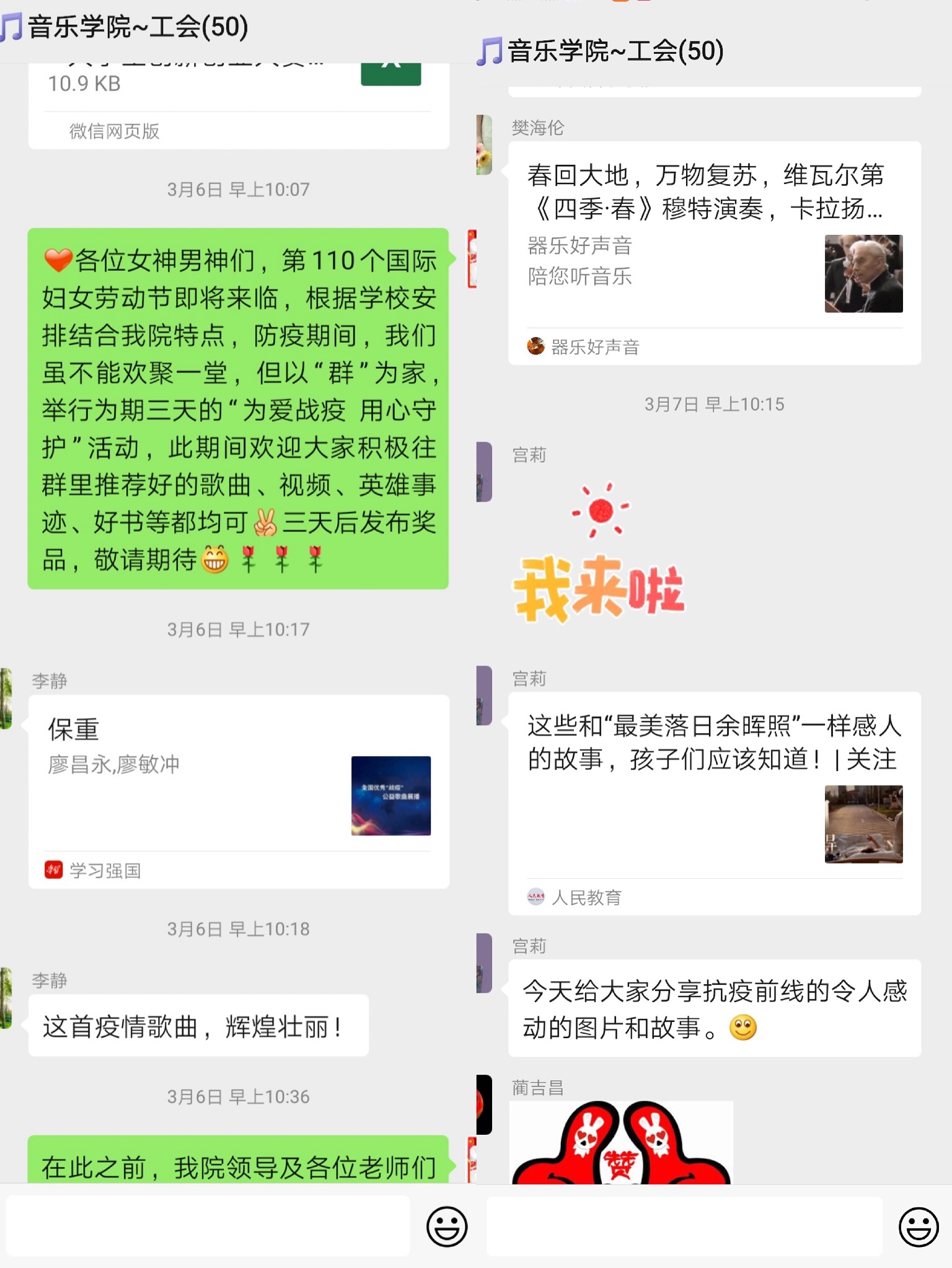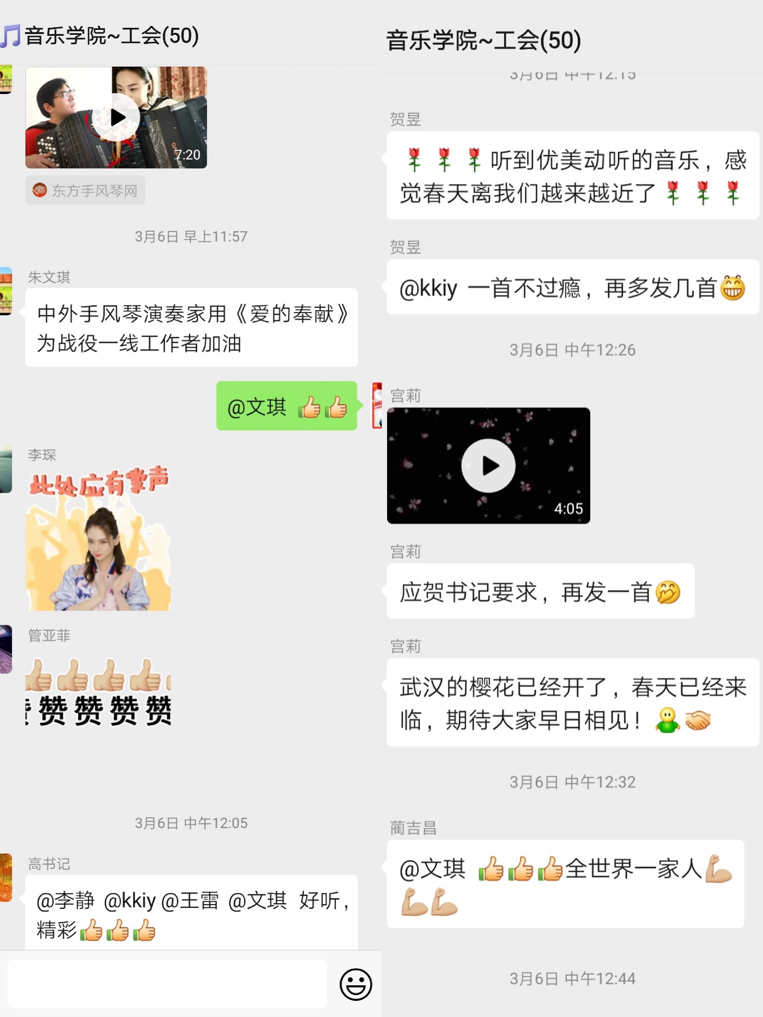 在工会群首先分享了由久久久久久九九99精品大老师们在疫情期间用“声”援疫的主要作品有:李静老师演唱的《开满花香的名字》、李冰老师表演的河南坠子《致敬!逆行者》、由刘晶和马锡骞老师创作,李琛、刘洋、李兴虎演唱的《谢谢你》、刘晶和贺昱老师朗诵的《新时代最可爱的人》、徐琦老师古埙演奏《假如爱有天意》。还有李静、宫莉、朱文琪、樊海伦、王雷等诸多老师们在群里分享、交流了歌曲《保重》《满城樱花》《九零后姑娘》、手风琴《爱的奉献》、小提琴《四季.春》、家书等多种形式的作品。