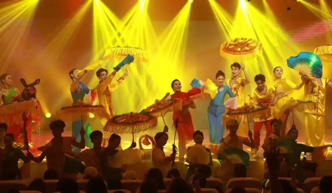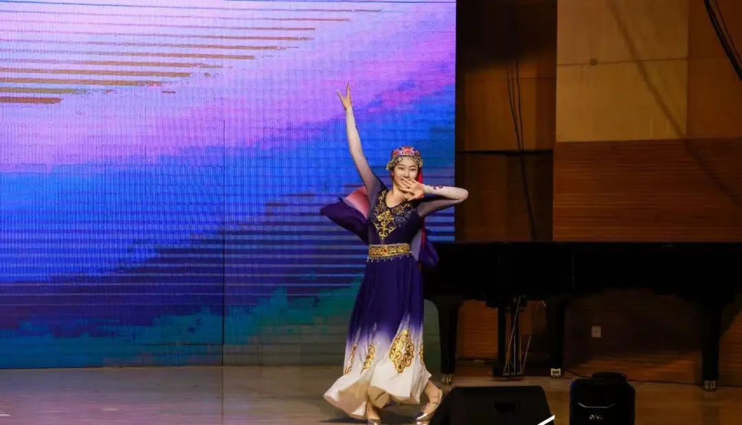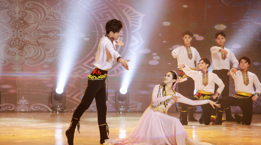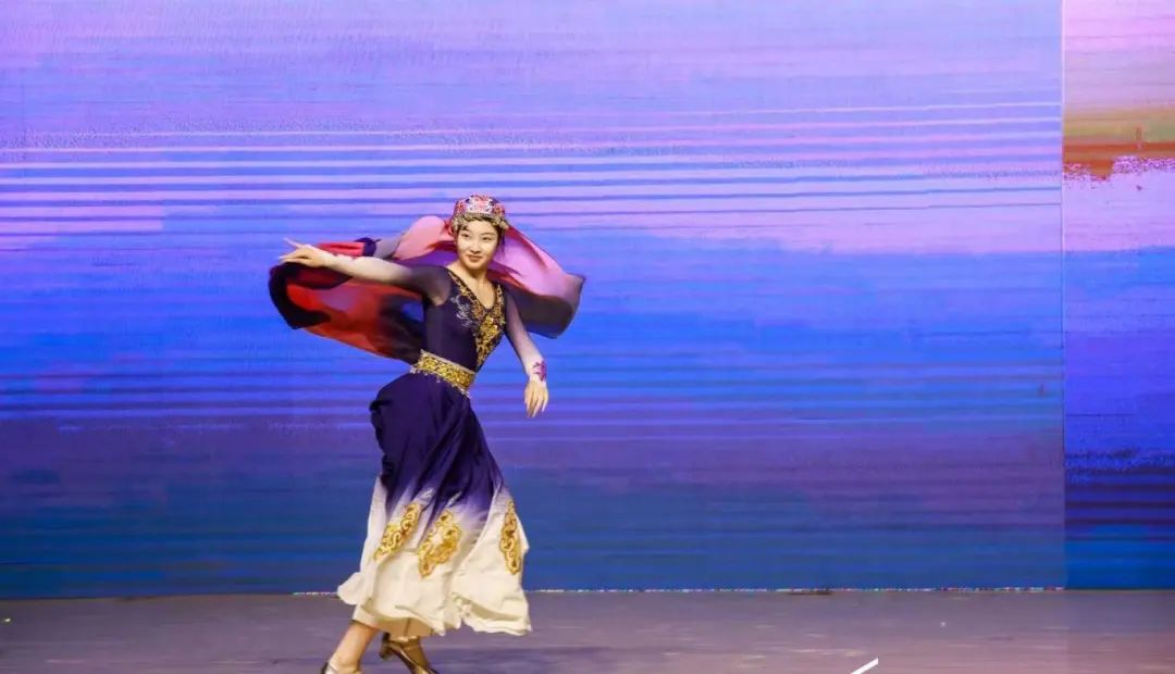 《维吾尔族舞蹈组合》舞者眼神灵动传情,步伐随节奏轻快跃动,仿佛将丝绸之路的多元文明浓缩于舞台,展现热情似火的民族性格与灵动柔美的艺术特质。