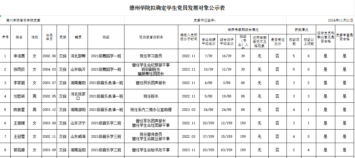 经党组织培养考察,征求党员、群众和培养联系人意见,支委会讨论研究、党委审查,拟确定申浩茜等19人为党员发展对象。为增强发展党员工作的透明度,接受党内外群众的监督,确保发展党员的质量,根据上级文件精神和《中共德州学院委员会发展党员工作实施细则》的要求,现将拟确定发展对象的基本情况公示如下(名单附后):