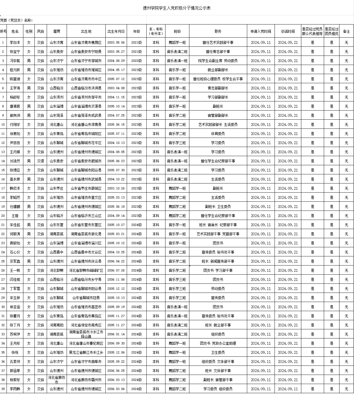 经党组织培养考察,通过党员、群众代表无记名投票推荐和团员推优,支委会讨论研究、党委审查,确定李白洋等39人为入党积极分子。为增强发展党员工作的透明度,接受党内外群众的监督,确保党员后备队伍的质量,根据上级文件精神和《中共德州学院委员会发展党员工作实施细则》的要求,现将新确定入党积极分子的基本情况公示如下(详见附表):