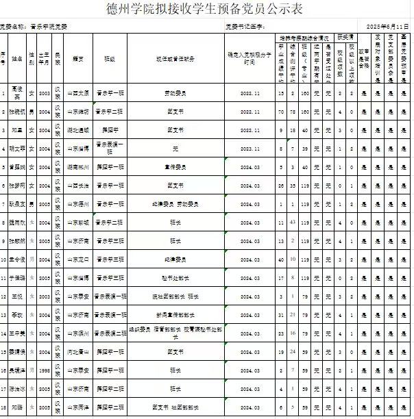 经党组织培养考察,征求党员、群众和培养联系人意见,支委会讨论研究、政治审查、集中培训、基层党委预审,拟接收高俊英等18名同志为中共预备党员。为增强发展党员工作的透明度,接受党内外群众的监督,确保发展党员的质量,根据上级文件精神和《中共德州学院委员会发展党员工作实施细则》的要求,现将拟接收预备党员的基本情况公示如下(名单附后):