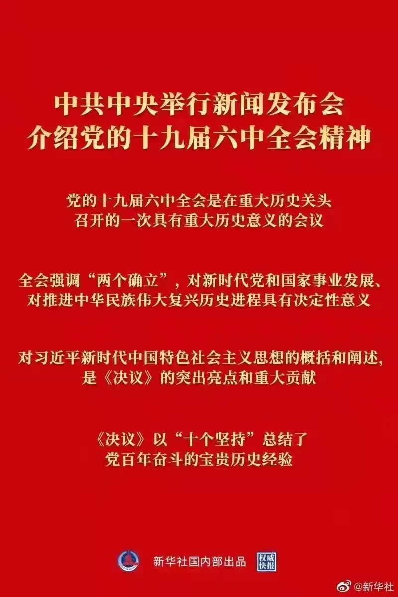 十九届六中全会总结了党的十八大以来各个领域的创造性思想、变革性实践、突破性进展、标志性成果。一百年来,我们党在生死斗争和艰苦奋斗中经受住各种风险考验,锤炼出鲜明的政治品格,形成了伟大的精神谱系。以史为鉴,方能开创未来。