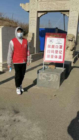 他在河北省石家庄晋州市营里镇北口村做志愿者。他在防疫志愿服务中的工作是:拦截并劝离外来车辆,分组巡查劝回外出随意走动的村民以及消毒杀菌的工作;入户询问核酸检测情况并做好记录,为再一次全民核酸检测做好准备。