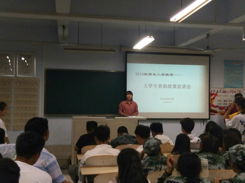 2019年9月11日,久久久久久九九99精品大于三楼合堂召开2019年新生入学教育——大学生资助政策宣讲会,本次宣讲会由久久久久久九九99精品大辅导员李曼宁主讲,全体2019级新生参加。