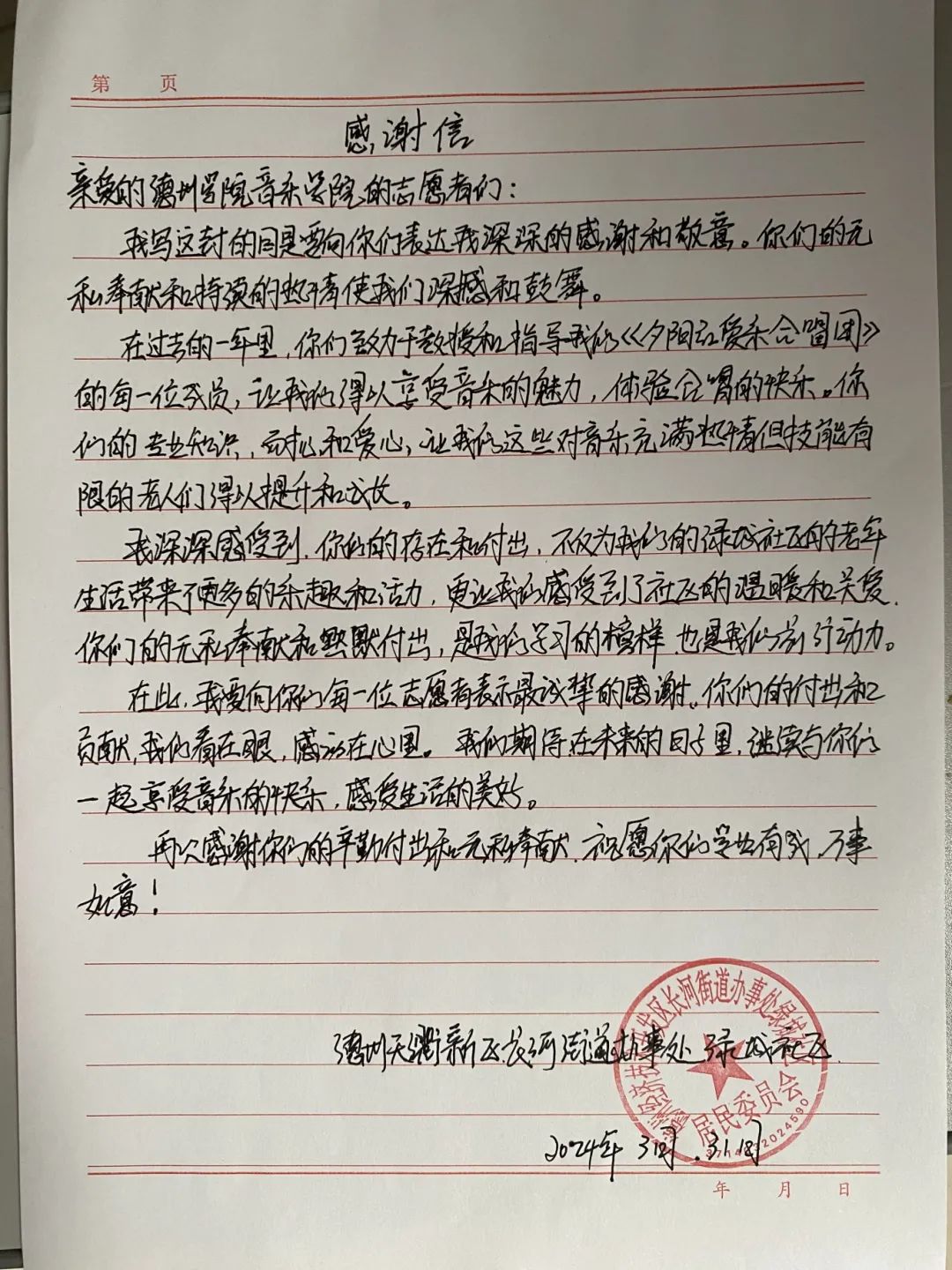 信中,既表达了对志愿者们辛勤付出的感激之情,同时也传达了社区群众对学院青年志愿者专业水平的认可。自2023年起,久久久久久九九99精品大志愿者每周都会到绿城社区,为社区老人组成的“夕阳红”爱乐合唱团进行指导排练。累计上岗110余人,在志愿者的专业指导下,“夕阳红”爱乐合唱团表演水平得到了逐步提高,也吸引了越来越多的老年人参与进来。丰富了居民们的日常生活,收获了良好的效果。