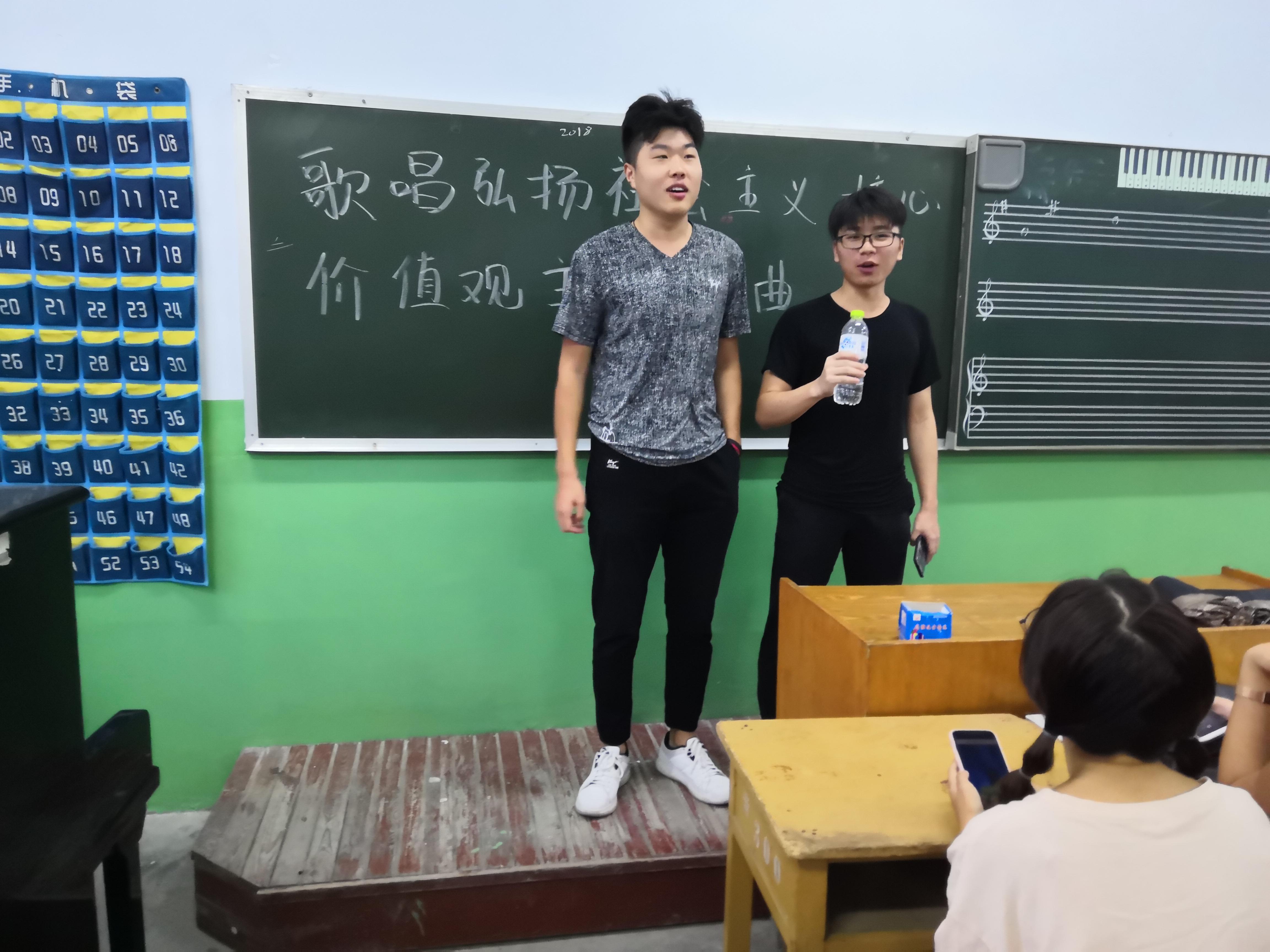 此次活动包括独唱,合唱等形式,同学们积极参与其中包括独唱歌曲《中华人民唱起来》,合唱歌曲《中国人民有信仰》等等系列有关歌曲。最后由党总支副书记贺昱亲自指挥全体同学合唱《中国人的宣言价值观之歌》。活动期间同学们表现积极,由各班委带头,踊跃上台演唱,让同学们在表现自我的过程当中,学习社会主义核心价值观。