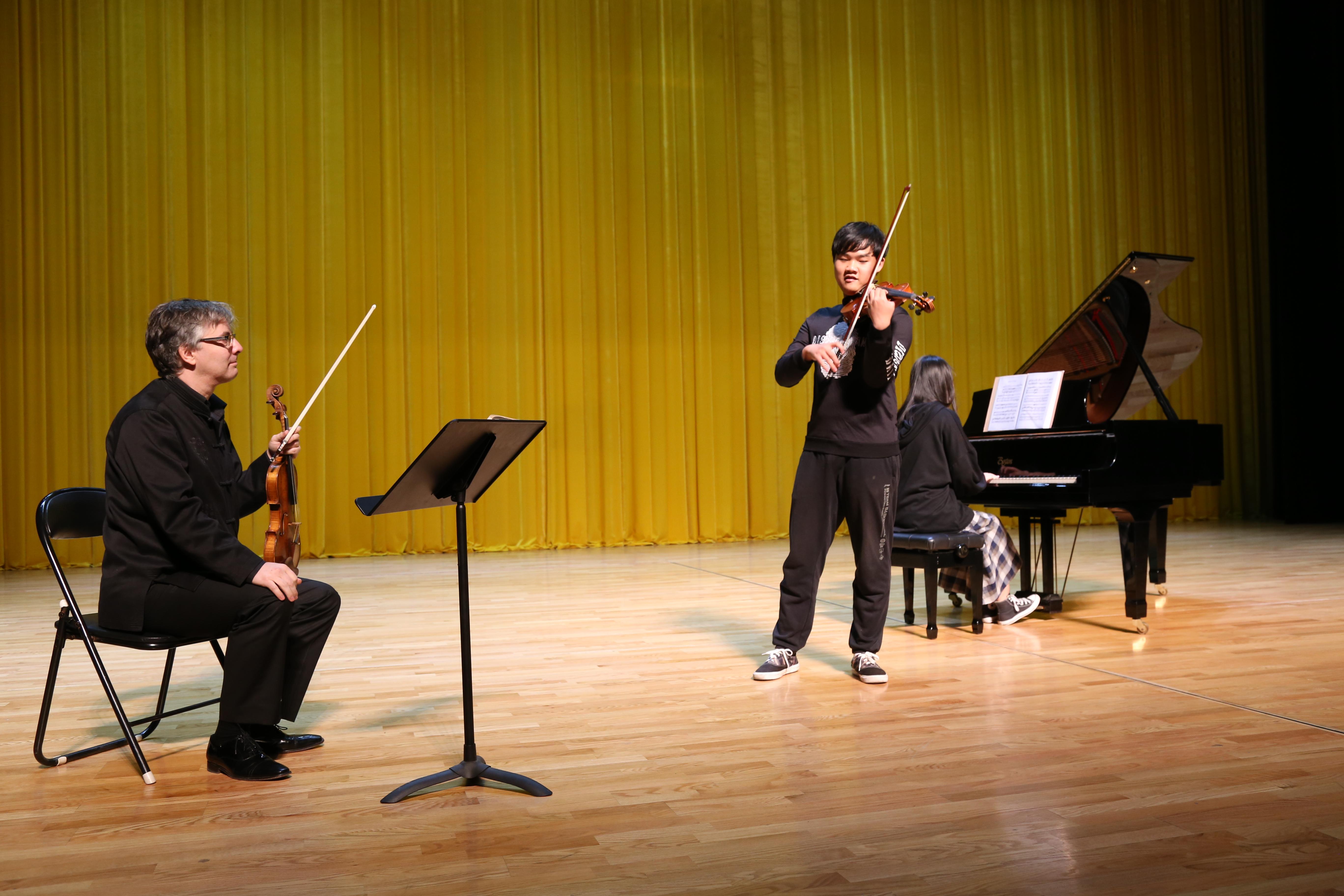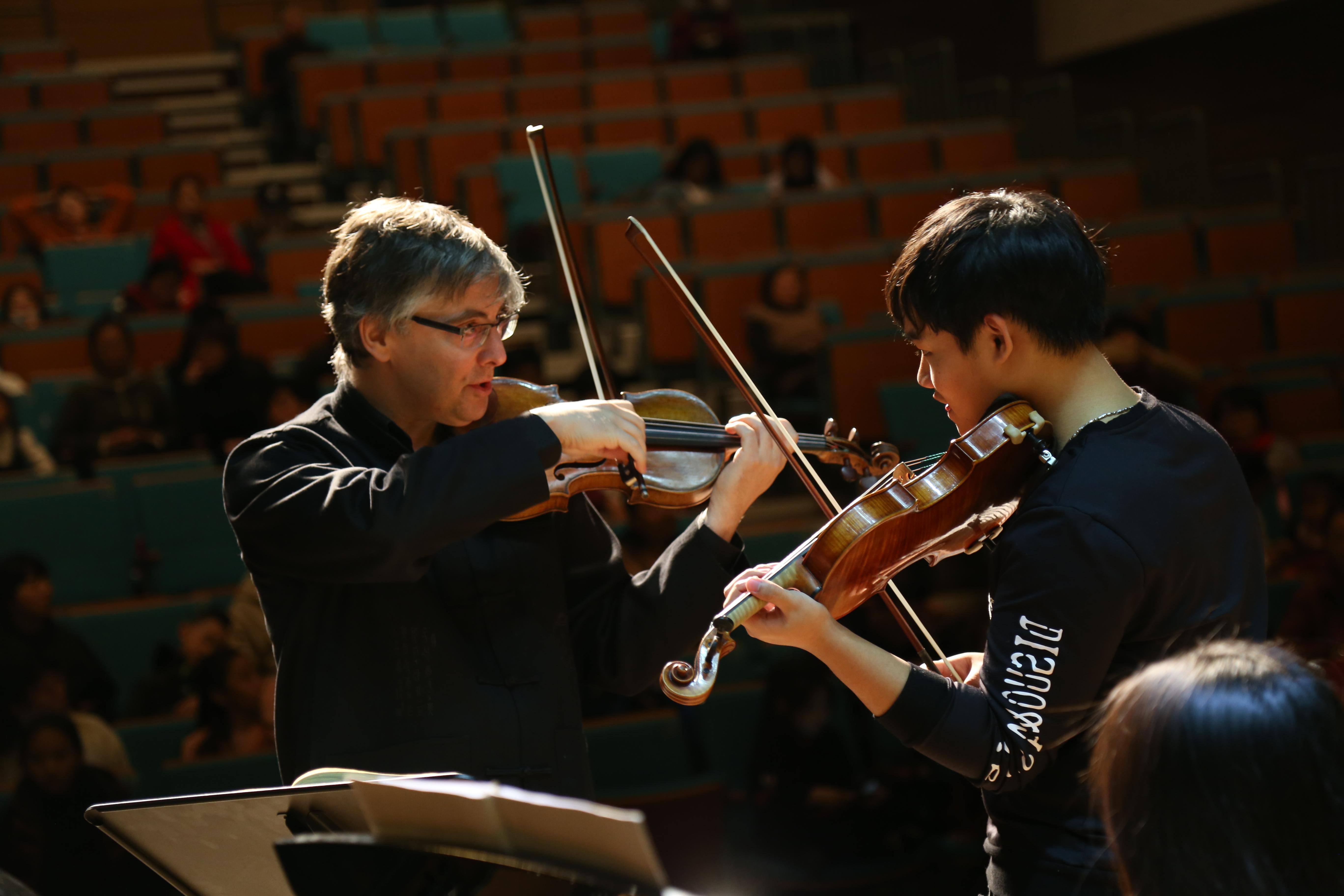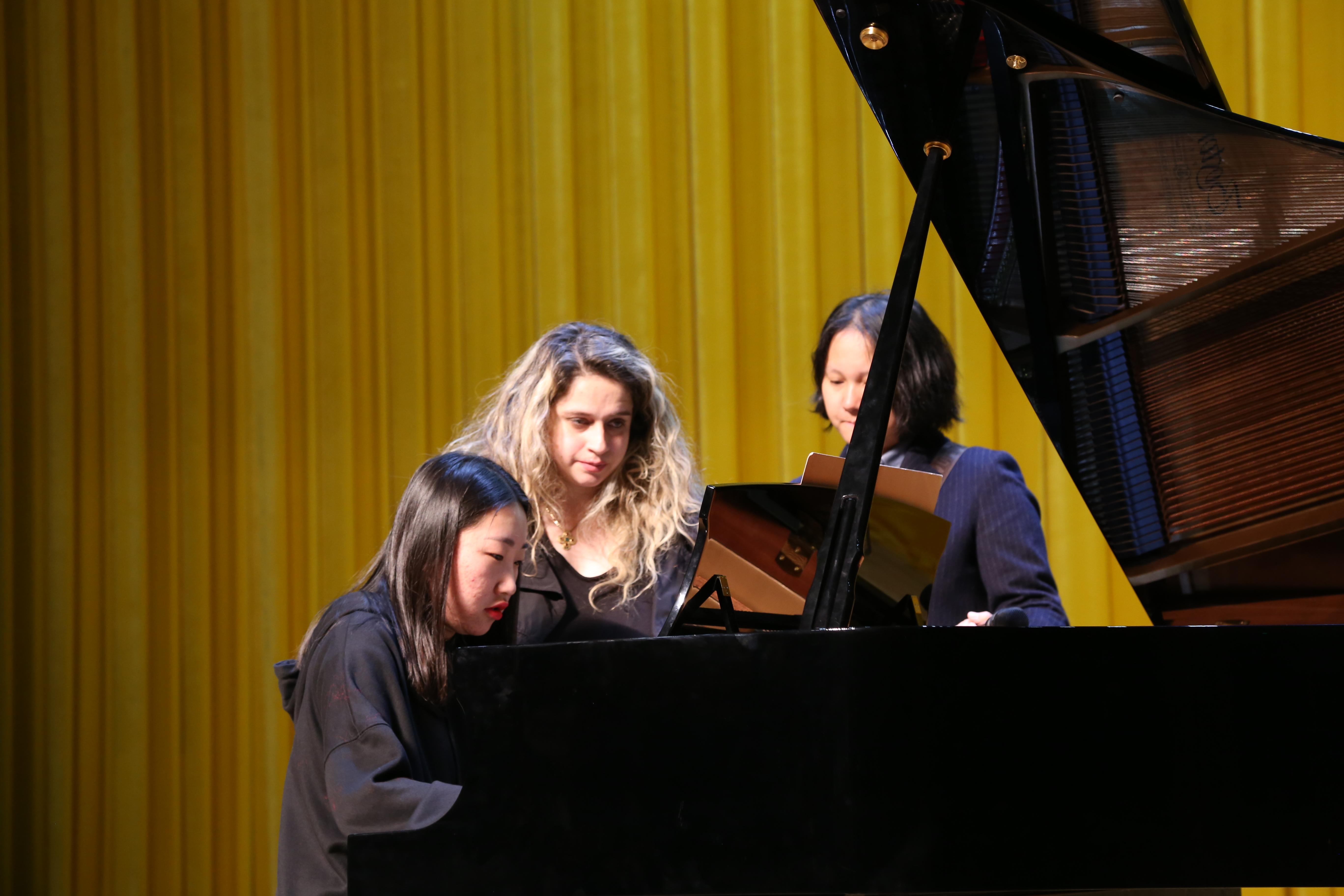 钢琴家西奥多西娅·恩托库首先对赵金津弹奏的李斯特的《森林呼啸》做出了点评,并从个别乐句的处理、音乐的表现及踏板的运用等方面给予了详细的指导。随后,小提琴家乔治·哈拉威姿卡从指法、把位、对音准的把握、运弓、乐句的表现等多方面对刘鲤彰演奏的拉罗的《西班牙交响曲》进行了细致的指导和示范。通过与大师近距离地对话和深层次地探讨,分享大师的思考、学识和智慧,在场的师生受到了启迪。