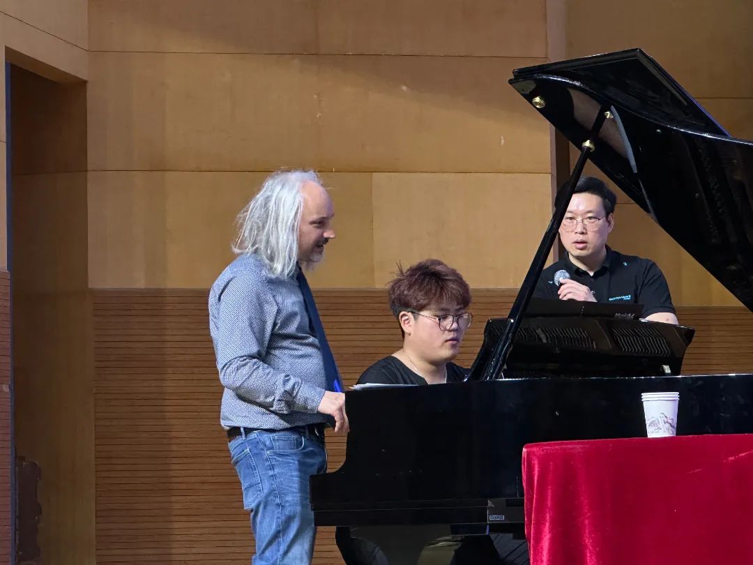 首先,段楚昀同学演奏的《肖邦练习曲No.1》,曲调悠扬婉转,卡罗· 帕里教授从钢琴演奏的指法、速度的选择、节奏的稳定性、力度的把握、技巧的熟练度等方面进行深度讲解;其次,赵盼盼同学演奏的《冬风练习曲》,是肖邦练习曲中技巧最艰深篇幅最大的音乐会练习曲之一;再次,袁浩同学演奏的《贝多芬奏鸣曲Op7 No.4》,钢琴声如天籁一般,奏出心中最柔软的歌谣;最后,马琳菲同学演奏的《贝多芬c小调奏鸣曲Op.10 No.1》,展现出对曲目的独特理解。卡罗· 帕里教授逐一细心指导与示范,并结合自身丰富的学识和演奏经验,对大家提出的每一个问题都做了细致的解答。