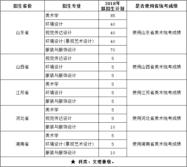 我校面向山东省招生的美术类本科专业使用山东省美术类专业统考成绩,对进档考生,美术学、视觉传达设计、环境设计、环境设计(说明:景观艺术设计方向)、服装与服饰设计等专业按专业大类实行平行志愿,按照综合分确定录取专业(综合分相同者,按文化课成绩从高到低择优录取)。综合分折算办法分别为:美术类专业按专业成绩占70%,文化成绩占30%,折算形成综合分(综合分=专业成绩*750/300*70%+文化成绩*30%)。