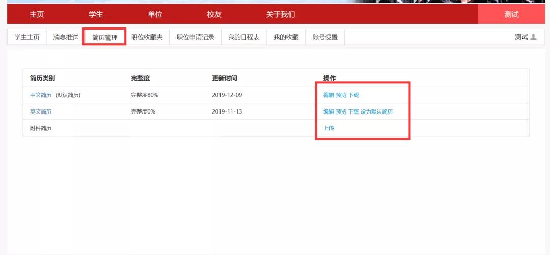学生登录后,可在线制作简历(中文简历、英文简历),也可以直接上传附件简历。