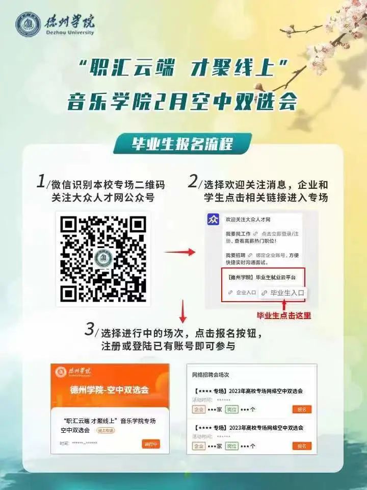 手机微信扫码关注“大众人才网”微信公众号,企业和毕业生分别点击相关按钮进入德州学院校招端口,点击本学院报名按钮,注册或登录已有账号即可直接参与。