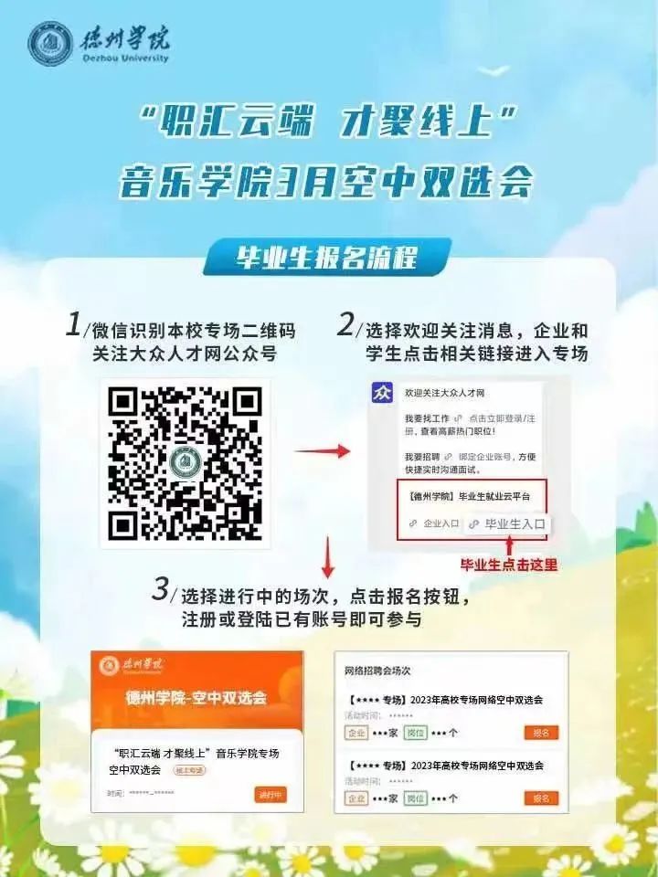 手机微信扫码关注“大众人才网”微信公众号,企业和毕业生分别点击相关按钮进入德州学院校招端口,点击本学院报名按钮,注册或登录已有账号即可直接参与。
