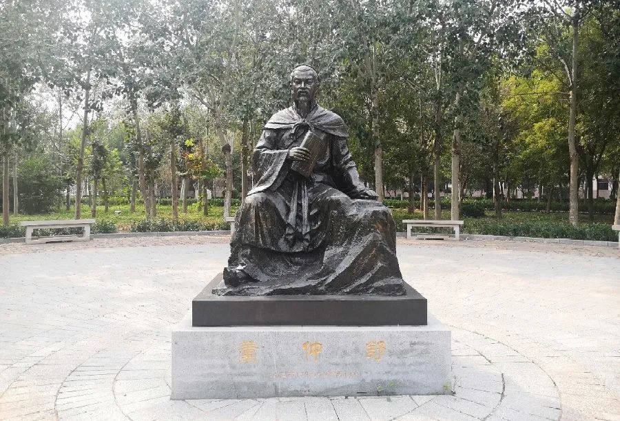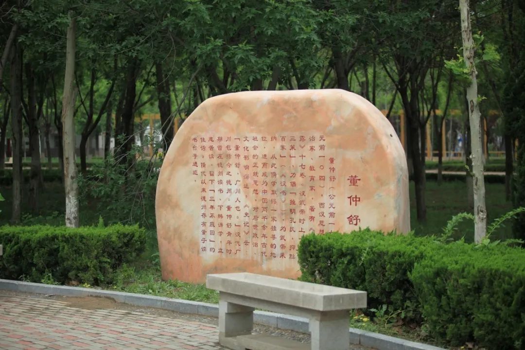 从孔子雕像向南看去走过,会看到关于董仲舒的雕塑,旁边的石碑,上面刻着董仲舒的介绍。