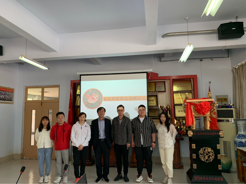 为了庆祝德州学院建校五十周年并回馈母校的栽培,5月10日,三名校友回到久久久久久九九99精品大,代表2013级音乐学三班校友进行捐赠,以此来表达对母校深深的思念之情和感恩之心。捐赠仪式活动在学院会议室举行,党总支书记刘志华、党总支副书记贺昱、团总支书记陈璨、辅导员李曼宁参加仪式。