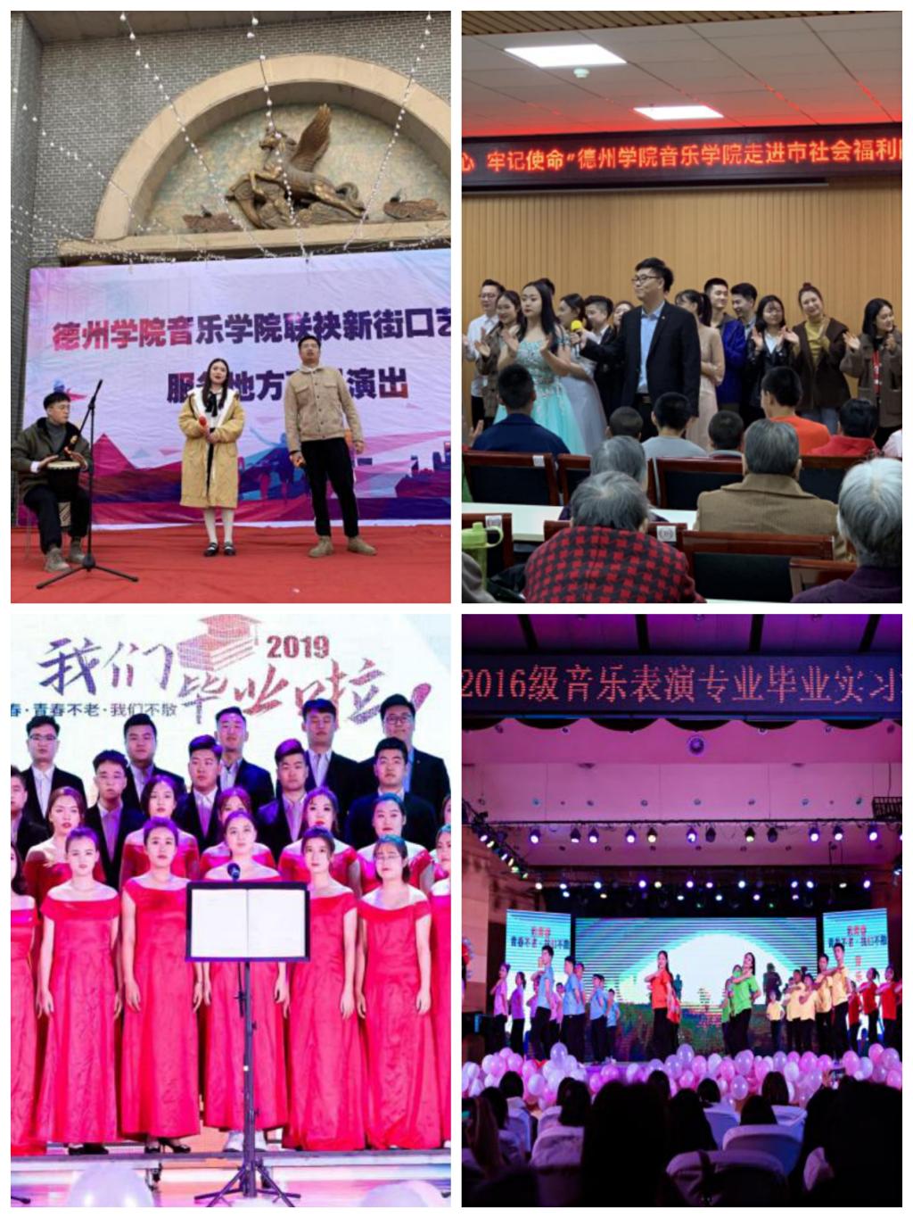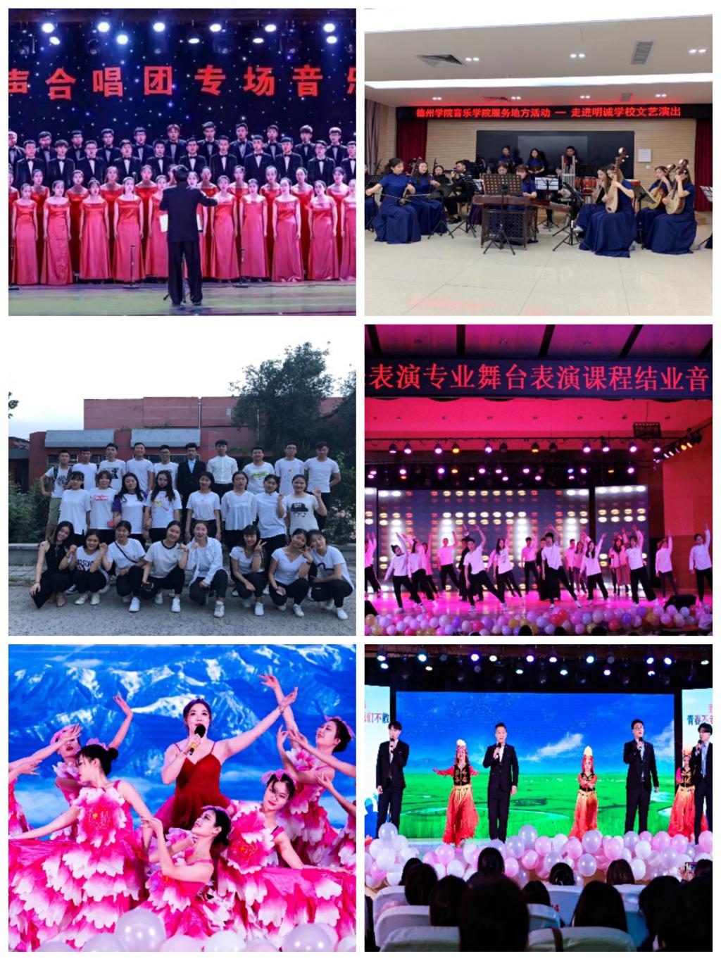 音乐表演专业秉承“实践育人”理念,以培养学生专业综合素质与实践创新能力相结合的实践育人思路,确立了“课堂—舞台—社会”三元结构实践教学体系。学生除在校内进行大量艺术社团排练、专业舞台实践外,还定期走乡村、进社区、入学校,通过舞台表演实践活动观察社会,服务地方文化建设。
