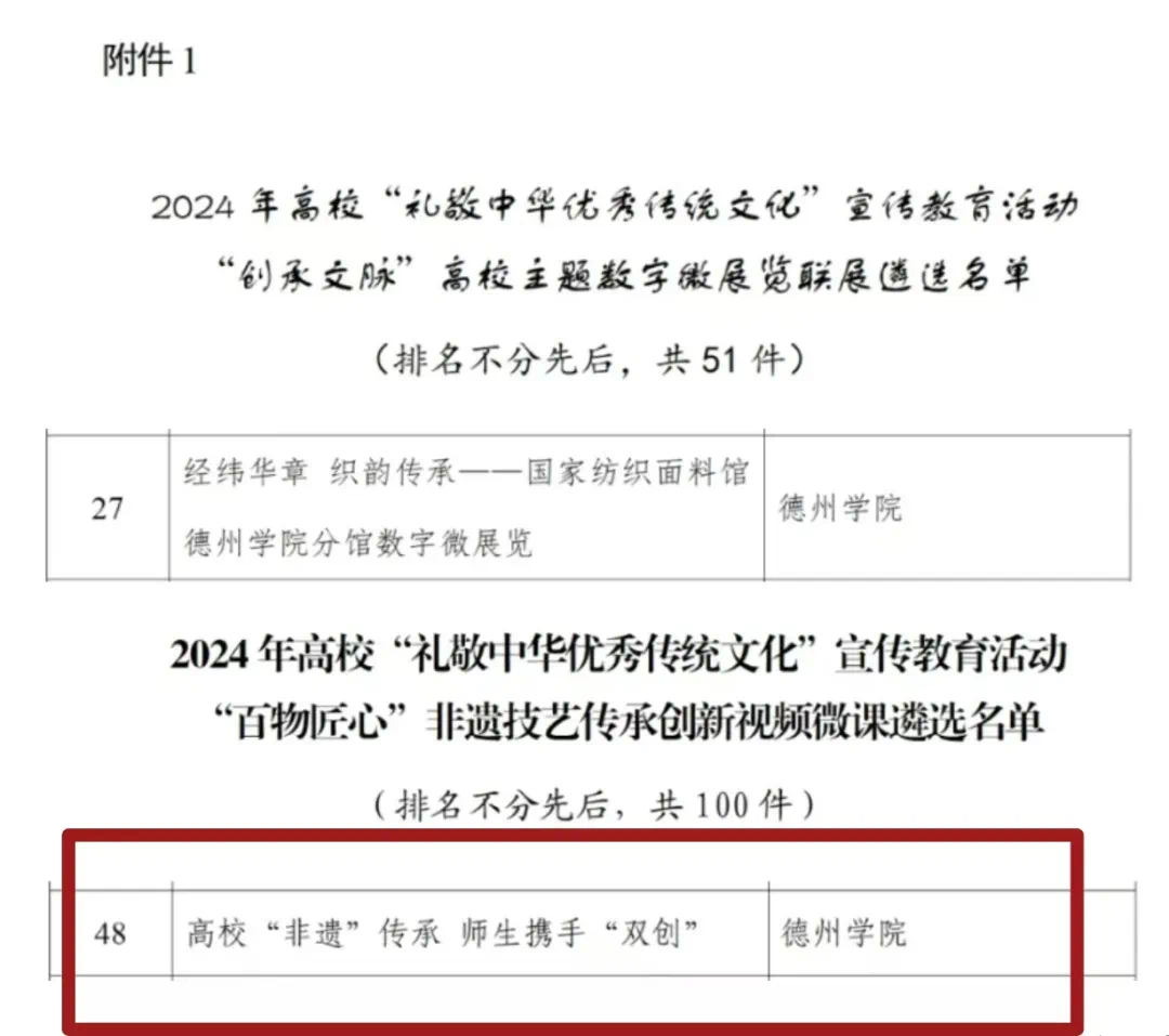 近日,教育部公布以“赓续文化血脉 筑牢信仰根基 谱写青春华章”为主题的2024年高校“礼敬中华优秀传统文化”宣传教育活动结果,我院选送的徐琦博士的视频《高校“非遗”传承师生携手“双创”》入选“百物匠心”非遗技艺传承创新视频微课遴选名单。
