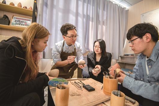 徐琦(左二)向德州学院刚入学的新生讲授古埙的手工制作技巧。
