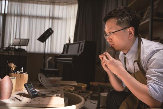 德州古埙工作室,徐琦使用校音器为他制作的陶埙反复校音,确定音准。