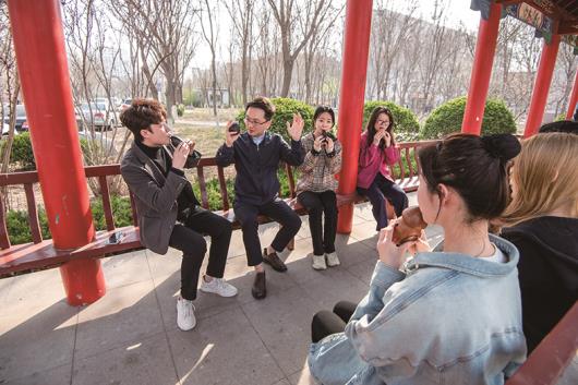 德州学院校园内的长廊上,徐琦(左二)教授学生古埙演奏技艺。