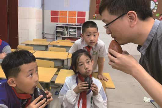 德州学院附属小学,徐琦教小学生吹奏古埙。