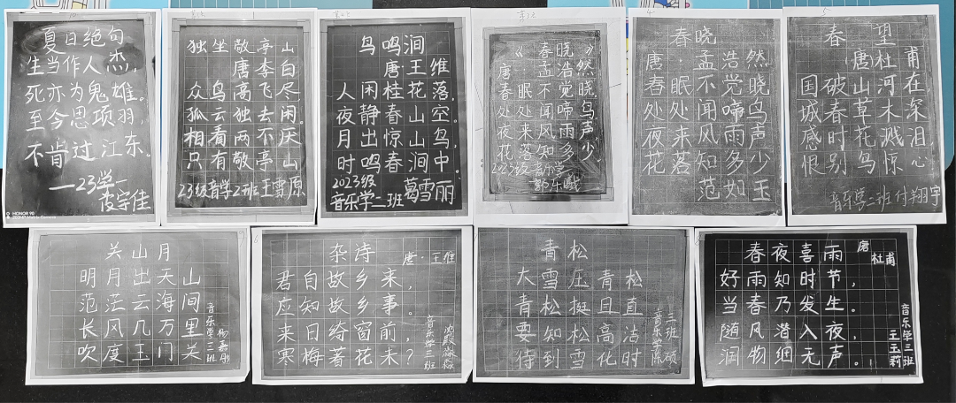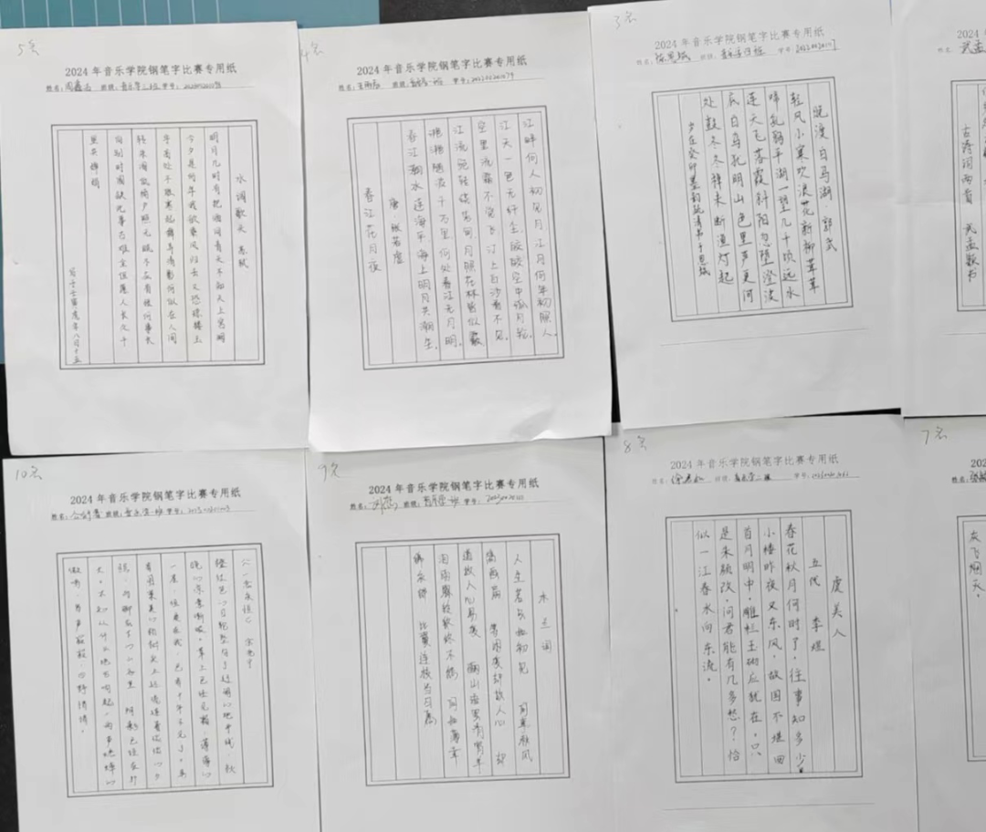 参赛者是音乐学系23级、22级全体师范生,比赛期间她们都使出了各自的“看家本领”,一笔一划,笔锋流畅、刚劲有力、工整清秀,充分展示了扎实的功底,给人以美的享受。各位评委老师们以专业的角度,高超的素质,本着公平公正公开的原则,进行评分,推选出各个年级钢笔、中性笔、粉笔的一、二、三等奖。