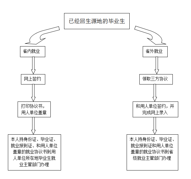 毕业生出省(跨省)就业的,在相应网站申请省外就业,然后带证件到学校领取就业协议书,与接收单位签约,并在相应“就业信息网”上录入签约信息后,持身份证、毕业证、就业报到证、就业协议书到山东省人社厅(教育厅)办理派遣手续。山东省外生源离校时就业报到证签发回户籍地的毕业生,在本省落实就业单位的,到本省用人单位所在地毕业生就业主管部门办理调整手续。