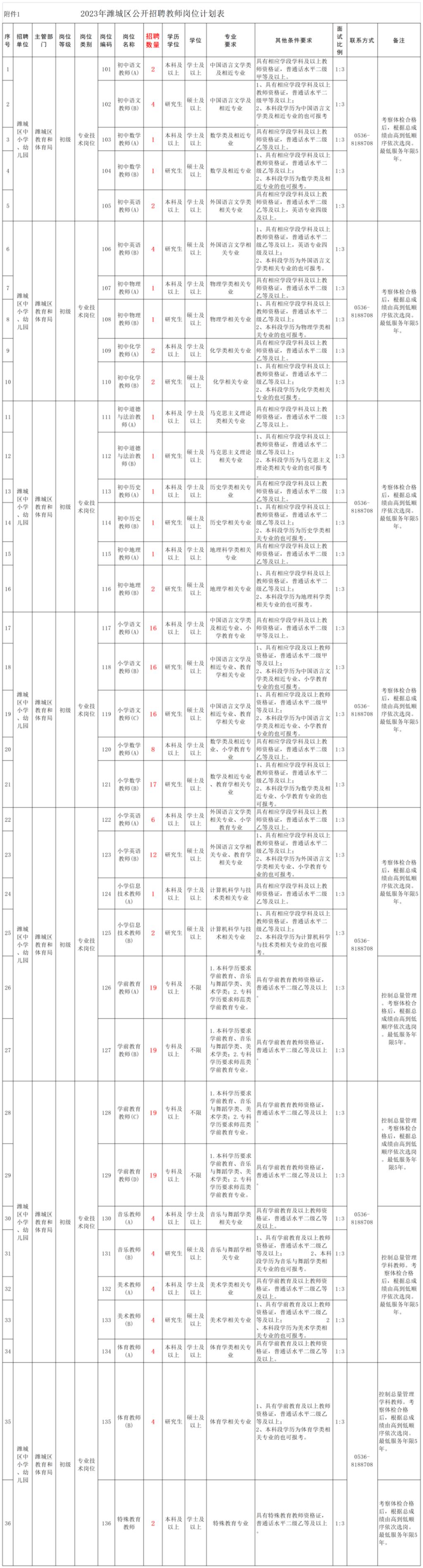本次面向社会招考在编中小学教师123名,控制总量幼儿园教师100名。具体招聘岗位及要求详见附件1。